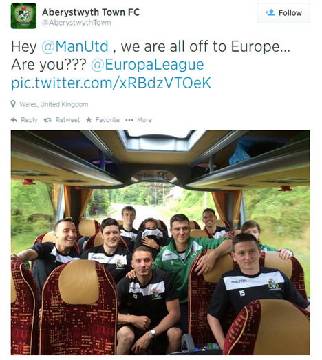 Lewat akun Twitter resmi mereka, Aberystwyh mengunggah foto para pemain mereka di bus dalam perjalanan ke markas Derry City, lengkap dengan caption, "Hey Manchester United, kami pergi ke Eropa, bagaimana dengan kalian?".