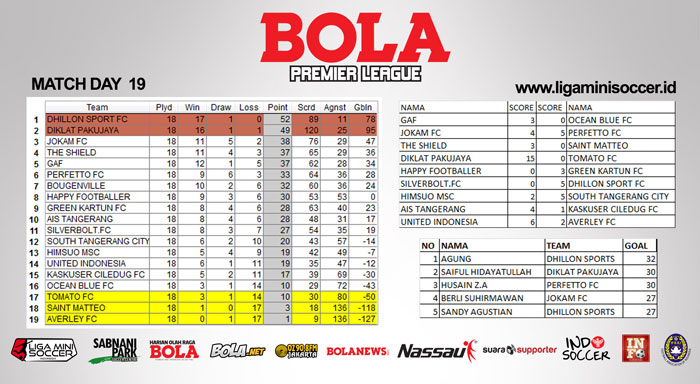 Bola.net - Tidak ada jeda kompetisi setelah putaran pertama Bola Premier League 2014/2015 berakhir. Pekan ke-19 sebagai pembuka putaran kedua Bola Premier League langsung digulirkan Sabtu (22/12) di Sabnani Park Soccer Centre.
