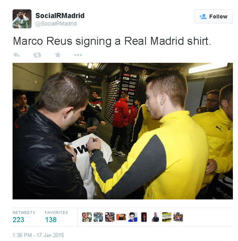 Kabar kepindahan Reus semakin kencang berhembus setelah beredarnya sebuah foto yang menghubungkan pemain 25 tahun ini dengan Real. Usai menjalani laga persahabatan kontra klub Rumania, Steaua Bucharest di Alicante, Reus tertangkap kamera tengah menanda tangani jersey Real Madrid.