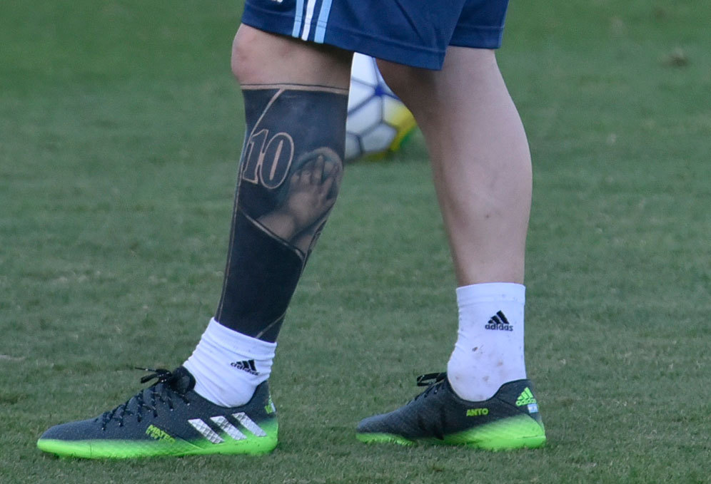 Penambahan tato baru ini pun membuat lutut kiri Messi kini jadi terlihat berwarna hitam sepenuhnya, seakan-akan Messi sedang memakai kaus kaki berwarna hitam.