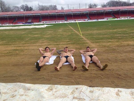 Ketiga pemain ini memanfaatkan kondisi lapangan stadion kandang klub mereka, Broadfield Stadium yang dipenuhi pasir sebagai pengganti pantai untuk berjemur!