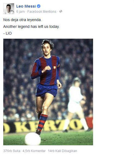 Ucapan bela sungkawa pun langsung berdatangan bagi legenda sepakbola asal Belanda ini. Messi pun juga ikut serta memberikan salam perpisahan pada pria yang dikenal mengusung dan mempopulerkan taktik 'Total Football' tersebut.