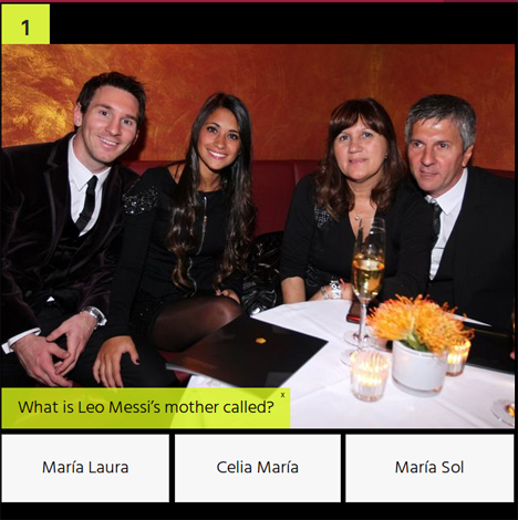 Dalam halaman khusus yang diluncurkan oleh tim Catalan, para penggemar bisa menjawab 15 pertanyaan mengenai kehidupan pribadi Messi untuk membuktikan seberapa familiar mereka dengan sang idola. Menariknya lagi, hasil kuis tersebut bisa di-share di akun media sosial seperti Facebook dan Twitter.
