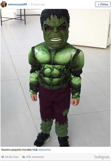 Ya, karena Hulk yang dimaksud adalah Thiago, buah hati Messi hasil hubungannya dengan Antonella Rocuzzo. Belum lama ini, sang bocah terlihat mengenakan topeng hulk, lengkap dengan kostum raksasa berwarna hijau tersebut.