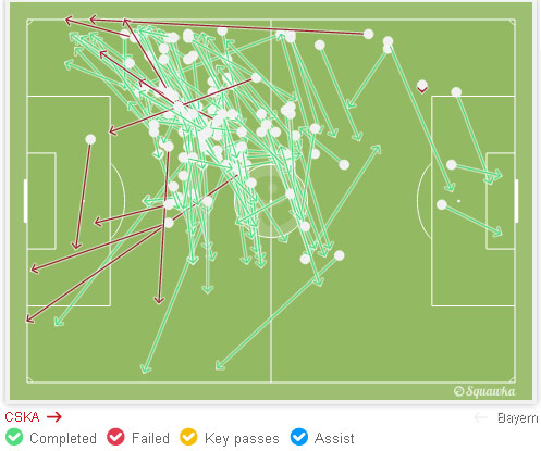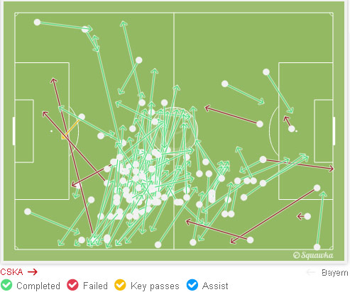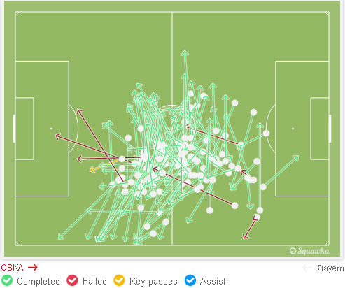 Bola.net - Bayern Munich membukukan total 918 operan ketika mengalahkan CSKA Moscow 1-0 lewat penalti Thomas Muller di Rusia pada matchday 2 Grup E Liga Champions 2014/15, Selasa (30/9).