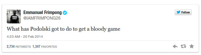 "Apa yang harus dilakukan oleh Podolski untuk mendapatkan kesempatan bermain," demikian tulisan sang pemain di akun Twitter miliknya.
