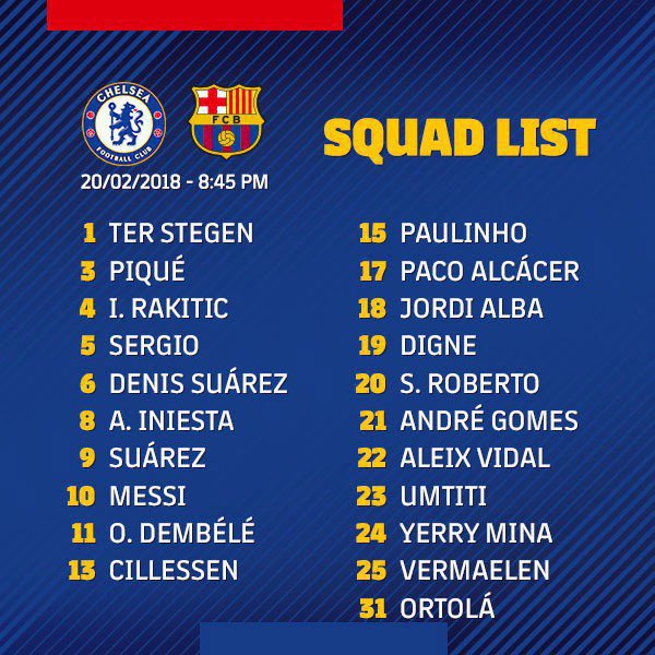 Jelang laga ini, Barca sudah mengumumkan skuat pada hari Minggu (18/2) waktu setempat. Sebanyak 21 pemain masuk dalam daftar rombongan Barca yang terbang ke Chelsea. Barca sendiri baru akan bertolak ke London pada hari Senin (19/2), setelah sesi latihan pagi.