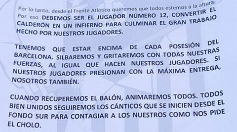 Kelompok pendukung garis keras Atletico Madrid atau yang lebih dikenal dengan Frente Atletico mengirimkan surat yang menuntut dukungan dari seluruh fan Atletico saat menjamu Barcelona.