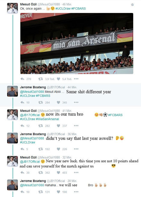 Menariknya, tweet ini langsung mendapat balasan dari bek Bayern, Jerome Boateng. Rekan setim Ozil di timnas Jerman itu yakin pertemuan kali ini akan bernasib sama bagi Arsenal, yakni kekalahan.