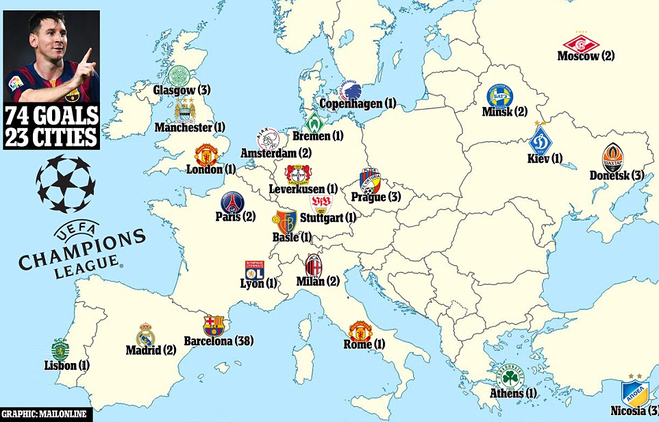 Usai mencetak hat-trick ke gawang APOEL (26/11) dan melewati catatan Raul dengan mengoleksi 74 gol, Messi resmi telah menggetarkan jala lawan di 23 kota dan 16 negara berbeda di Eropa, selama bermain di Liga Champions, menurut laporan yang dilansir Daily Mail.