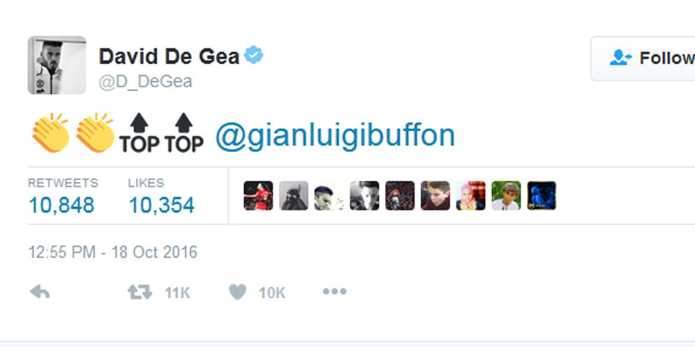 Lewat akun twitter miliknya, De Gea memberikan emoji tepuk tangan tangan dan tanda panah ke atas yang disertai dengan kata 'TOP'. Hal ini jelas menandakan sebuah pujian kepada Buffon.