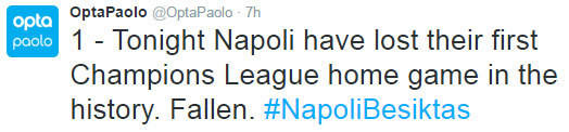 Sepanjang sejarah partisipasinya di Liga Champions, Napoli belum pernah kalah di kandang sendiri. Besiktas merusak rekor kandang Napoli tersebut dengan finishing touch yang terbilang cukup 'sadis'.