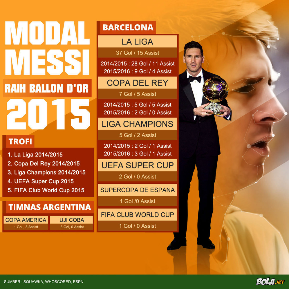 Ditunjuknya Messi sebagai peraih trofi Ballon D'Or tahun 2015 ini memang sudah diprediksi oleh banyak pihak mengingat kontribusinya yang luar biasa baik di level klub maupun di Timnas Argentina sepanjang tahun 2015 ini. Pencapaian-pencapaiannya bisa dilihat pada infografis di bawah ini.
