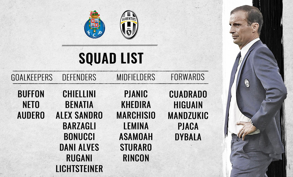 Pelatih Massimiliano Allegri sudah menentukan skuat yang akan tampil pada laga ini. Sebelum disusutkan, Allegri memutuskan untuk membawa 23 pemain untuk terbang ke Portugal guna menantang Porto.