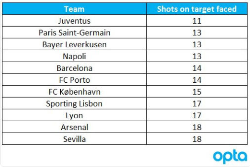 Tim yang menghadapi shots on target paling sedikit di fase grup Liga Champions 2016/17: