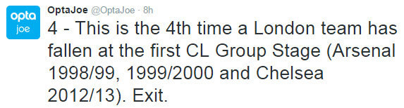 Sepanjang sejarah Liga Champions, ini adalah kali keempat tim asal London gugur di fase grup pertama. Tiga kegagalan sebelumnya tercatat atas nama Arsenal pada edisi 1998/99 dan 1999/00 serta Chelsea di musim 2012/13.