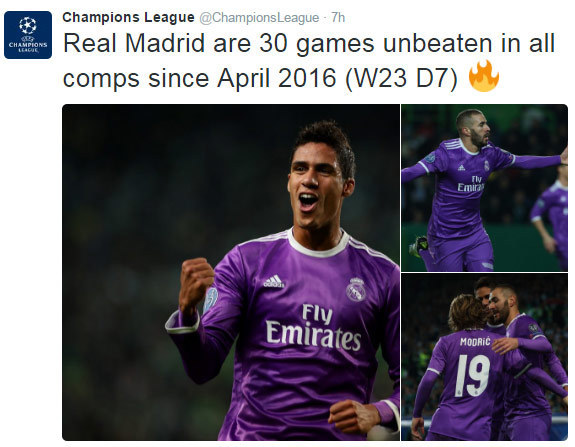 Bola.net - - Real Madrid menang 2-1 di markas Sporting Lisbon pada matchday 5 Grup F Liga Champions 2016/17, Rabu . Dengan hasil ini, berarti pasukan Zinedine Zidane masih belum tersentuh kekalahan dalam 30 laga beruntun di semua ajang sejak April 2016.