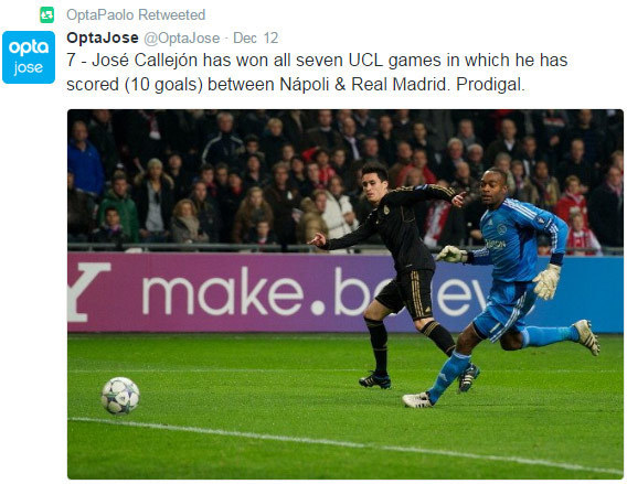 Setiap kali Callejon mencetak gol di pertandingan Liga Champions, maka tim yang diperkuatnya pasti menang. Itu sudah terjadi sejak penyerang sayap Napoli asal Spanyol tersebut masih memperkuat Madrid.