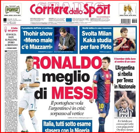 Corriere sebenarnya membuat analisis mengenai tiga calon kuat penerima Ballon d'Or musim ini; Ronaldo, Messi dan Franck Ribery. Secara umum, Corriere menyebut Ronaldo tahun ini lebih bagus dari Messi jika dinilai dalam aspek individual.