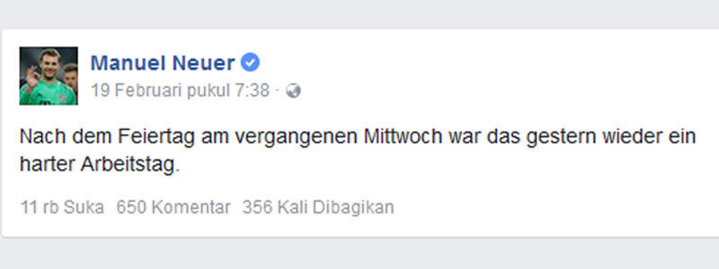 "Setelah berlibur pada rabu lalu, kemarin adalah hari yang sulit dan kami harus bekerja keras lagi," tulis Neuer di akun Facebook miliknya.