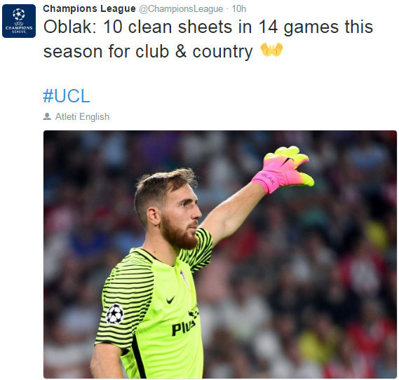 Musim ini, Oblak sudah melakoni 11 penampilan bersama Atletico. Dalam 11 penampilan itu, Oblak membukukan delapan clean sheet dan cuma kebobolan tiga kali.