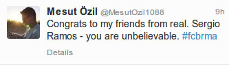 "Selamat untuk teman saya di Real Madrid, Sergio Ramos, anda benar-benar luar biasa," tulis Ozil di akun Twitter resmi miliknya, @MesutOzil1088.
