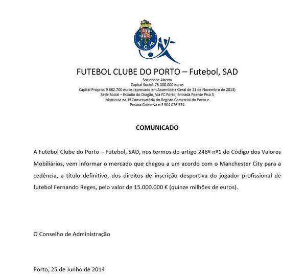 FC Porto, sebagai klub sepakbola yang merujuk pada Code of Commercial Values, menginformasikan kepada para pemegang saham bahwa telah tercapai kesepakatan dengan Manchester City terkati perpindahan kepemilikan pesepakbola profesional Fernando Reges, dengan nilai transfer 15 juta Euro.