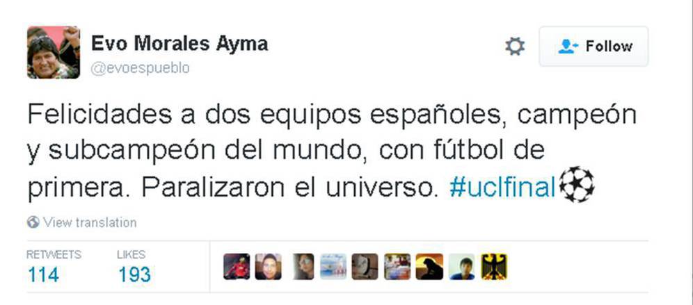 Morales menulis: "Selamat untuk dua tim Spanyol, juara dan runner-up di kompetisi sepakbola terbaik. Kalian sudah memukau seluruh dunia."