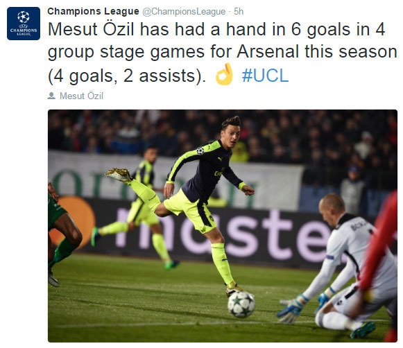 Ozil merupakan salah satu pemain paling bersinar di Liga Champions musim ini. Dalam empat pertandingan yang sudah dimainkan Arsenal di fase grup, gelandang Jerman itu berkontribusi langsung terhadap enam gol timnya (4 gol, 2 assist).