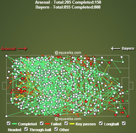 Berdasarkan statistik WhoScored, Arsenal kalah ball possession dengan telak sampai 21% berbanding 79%. Dari data Squawka, Arsenal bahkan hanya membukukan total 205 operan dengan 150 yang tepat sasaran, sedangkan Bayern tak tertandingi dengan 855 passes serta 808 completed passes.