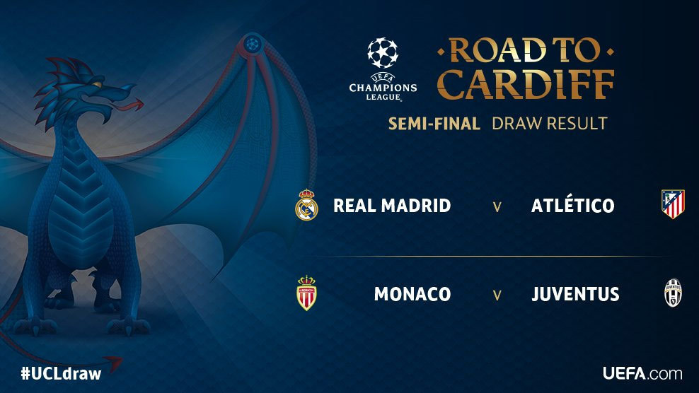Juventus diundi bertemu AS Monaco di babak semifinal. Sementara itu, partai satunya mempertemukan Real dengan sang rival sekota Atletico Madrid
