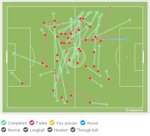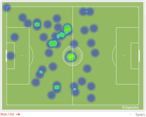 Laga kontra Spurs kemarin merupakan untuk pertama kalinya Carrick turun sebagai starter, setelah absen panjang akibat cedera otot sejak laga kontra QPR pada pertengahan Januari silam. Carrick langsung membuktikan kualitasnya dengan menjadi boss di lini tengah United. Berikut adalah diagram umpan yang menunjukkan mobilitas tinggi serta distribusi bola yang dilakukan oleh sosok 33 tahun tersebut.