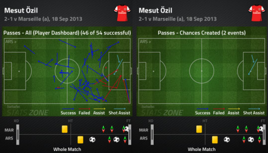 Melawan Marseille, Ozil tampak masih cukup berhati-hati dalam mendistribusikan bola dari posisi yang lebih dalam sebelum akhirnya melepas sejumlah pass berbahaya di wilayah lawan - di mana dia menciptakan dua peluang dari sektor kiri serangan timnya.
