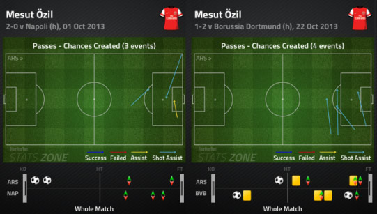 Ozil merancang assist brilian untuk Olivier Giroud ketika melawan Napoli di matchday 2 dan menciptakan empat peluang kontra Borussia Dortmund di Emirates Stadium pada matchday 3 - semua berupa umpan silang dari sayap kanan.