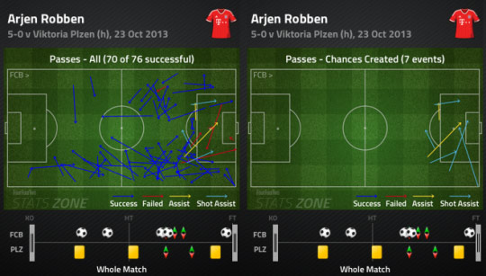 Saat Bayern Munich melawan CSKA Moscow serta Manchester City, Robben bermain cukup 'tenang' dan hanya membukukan masing-masing satu key pass di dua laga tersebut. Namun, ketika Bayern menghancurkan Viktoria Plzen 5-0 di matchday 3, Robben menunjukkan bahwa dia juga bisa berperan sebagai kreator kalau memang dibutuhkan.