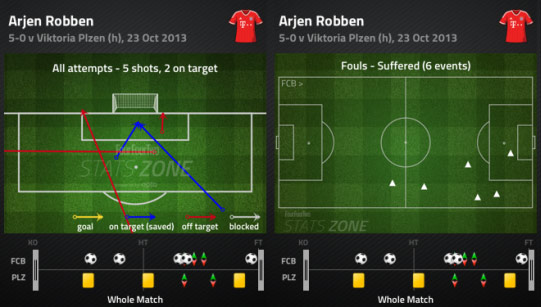 Lini belakang Plzen benar-benar dibuat diberantakan oleh Robben, yang rasio operannya mencapai 92% dan menciptakan tujuh peluang.