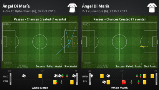 Saat Madrid melumat FC Copenhagen 4-0, kita bisa melihat bagaimana kehebatan Di Maria dalam melepas umpan-umpan silang. Kala melawan Juventus di matchday 3, Di Maria merancang assist untuk Ronaldo dengan through pass sempurna yang sanggup mengacaukan barisan pertahanan La Vecchia Signora.