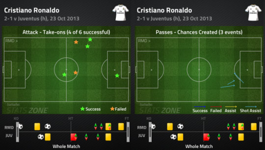 Melawan tim yang lebih kuat, yaitu Juventus di matchday 3, ketika dia melesakkan dua gol dalam kemenangan 2-1 Madrid, Ronaldo juga melakukannya. Mengawali laga di sektor kiri, di mana sebagian besar dribelnya menjadi ancaman bagi Juventus, kreativitas Ronaldo justru terlihat di sayap satunya.