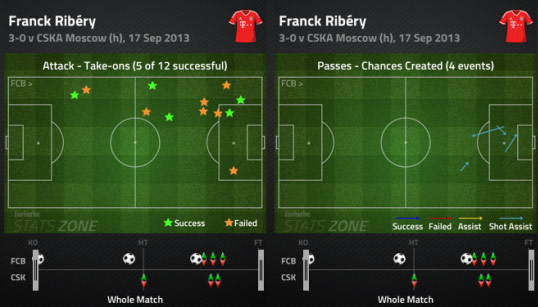 Starter reguler di sayap kiri Bayern, Ribery merupakan ancaman konstan dengan dribel dan kreativitasnya. Saat bermain melawan CSKA Moscow, itu terlihat jelas dari 12 dribel dan empat peluang yang dihasilkannya.