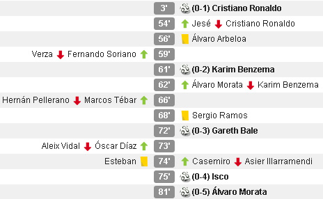 Pasukan Carlo Ancelotti tak terhadang di Andalusia, Minggu (24/11). Cristiano Ronaldo langung membuka keunggulan memanfaatkan crossing Isco ketika laga baru berjalan tiga menit. Forward Portugal yang beberapa hari lalu mencetak hat-trick ke gawang Swedia itu lalu digantikan Jese Rodriguez pada menit 54. Tujuh menit sesudahnya, Jese merancang asisst untuk gol kedua Madrid oleh Karim Benzema. Pada menit 72, skor berubah jadi 3-0 berkat aksi Gareth Bale. Tiga menit berselang, Isco menjadikannya 4-0 berkat assist kedua Jese. Pemain pengganti Alvaro Morata menutup pesta dengan golnya hasil assist sesama substitute Casemiro sembilan menit jelang bubaran.