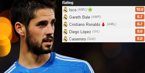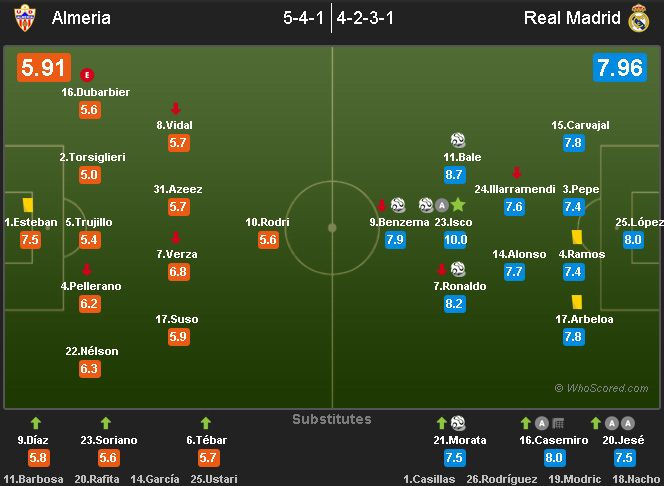 Di pihak Madrid, semua bermain gemilang. Namun, lima nama inilah yang terdepan. Mereka adalah Isco (3 shot, 1 gol, 9 key pass, 1 assist), Bale (10 shot, 1 gol, 3 dribel sukses), Ronaldo (8 shot, 1 gol, 3 dribel sukses) dan Casemiro (1 shot menerpa mistar, 3 key pass, 1 assist). Tak ketinggalan pula Diego Lopez, yang menetralisir 4 shot on target Almeria melalui Aleix Vidal, , Ramon Azeez serta .