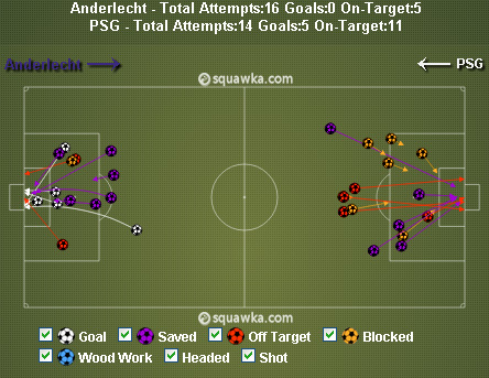PSG sebaliknya. Walaupun kalah tipis jumlah tembakan, efektivitas serangan mereka sanggup memberi luka yang lebih signifikan. Total ada 11 tembakan tepat sasaran yang dilancarkan PSG. Kalau bukan karena kesigapan Thomas Kaminski, Anderlecht pasti sudah kebobolan lebih dari lima.