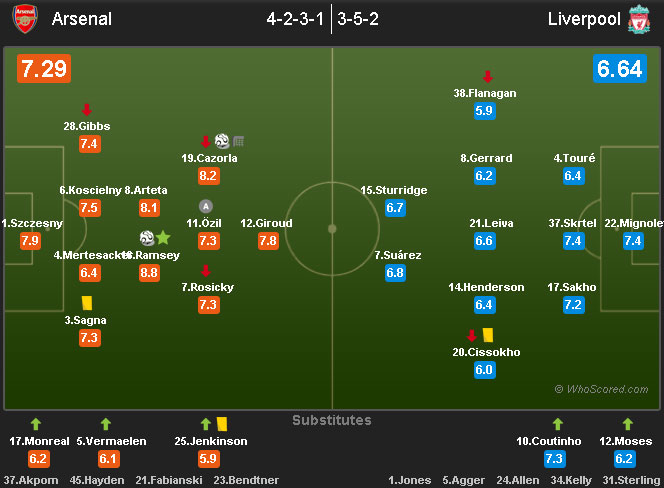 Mikel Arteta dan Ramsey memberi Arsenal keseimbangan dari posisi gelandang bertahan, sementara Giroud dan Cazorla nyaris tanpa henti menciptakan ancaman di wilayah lawan. Wojciech Szczesny tampil brilian dengan mementahkan semua shot on target Liverpool melalui Sturridge dan Coutinho. Lima pemain itulah yang berperan sangat besar dalam kemenangan Arsenal.