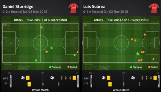 Liverpool sendiri cukup kesulitan dalam membangun serangan akibat tertekannya para gelandang mereka. Hasilnya, Luis Suarez dan Daniel Sturridge pun lebih sering berusaha sendirian dengan dribel di lini depan. Hanya saja, upaya-upaya tersebut banyak yang gagal.