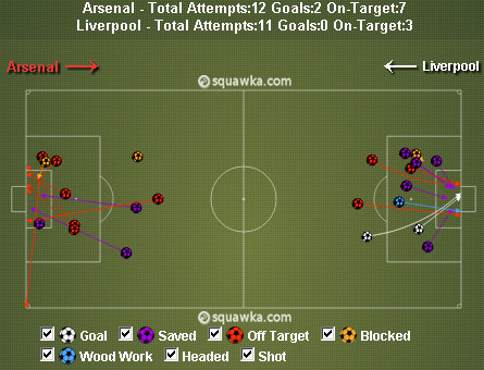 Barisan tengah Arsenal sanggup menguasai permainan dan memaksa Steven Gerrard, Lucas Leiva serta Jordan Henderson lebih banyak membantu pertahanan daripada menyusun serangan. Saat Liverpool dibuat mengejar bola, Arsenal melepas operan-operan ke belakang Jon Flanagan dan Aly Cissokho. Hal ini menyebabkan Bacary Sagna cukup leluasa mengiris dari sektor kanan.