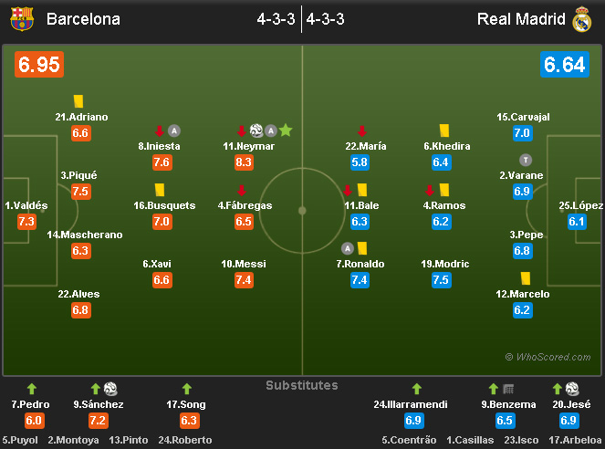 Di Camp Nou, Sabtu (26/10), pasukan Gerardo Martino menang berkat gol Neymar pada menit 19 dan chip indah pemain pengganti Alexis Sanchez memanfaatkan through ball Neymar pada menit 78. Madrid hanya bisa menipiskan selisih skor melalui finishing sang substitute Jese Rodriguez hasil assist Cristiano Ronaldo lewat sebuah fast break di masa injury time.