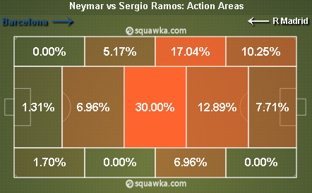 Ramos, yang diplot sebagai penutup ruang antara lini kedua dan para forward Barcelona, gagal menjalankan tugasnya dengan baik. Penyebabnya adalah Neymar, yang membuat pemain Spanyol itu melakukan pelanggaran berujung kartu kuning ketika laga baru berjalan 14 menit. Sejak itu, geraknya jadi terbatas karena dikekang ancaman keluar arena dengan kartu kuning kedua.