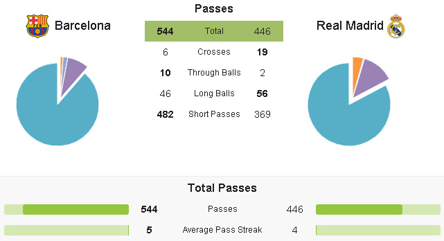 Di lain pihak, Barcelona yang tak lagi terlalu fokus pada tiki-taka seperti beberapa musim terakhir, menampilkan permainan yang cukup berbeda. Kombinasi operan pendek, long ball, through pass dan crossing yang dikomandani , Sergio Busquets dan Iniesta dari lini kedua sanggup membuat Madrid tertekan.