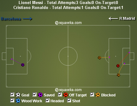 Sepanjang laga, Messi hanya bisa melepas 3 shot namun tak ada satu pun yang on target. Sementara itu, Ronaldo bahkan cuma punya 1 shot sekaligus 1 shot on target, tapi sejumlah gerakan di sayap kiri serta satu assist-nya membuat sang bintang Portugal mendapat rating yang sama dengan La Pulga.