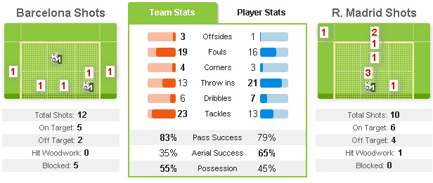 Macetnya Ronaldo cukup ter-cover oleh Luka Modric dan Sami Khedira. Modric tampil cukup impresif sebagai pembagi bola di lini tengah dan membuat Khedira bisa menciptakan 3 shot on target (terbanyak di kubu Madrid) dan Benzema sekali mengancam Victor Valdes namun tembakannya menerpa mistar.